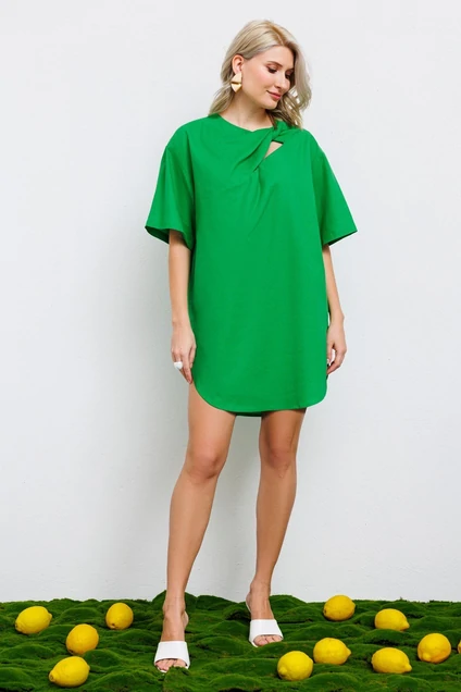 Платье прямого силуэта. По переду расположен вырез и декоративный узел. Платье с перепадом длины. Застежка по спинке на потайную молнию.