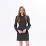 Приталенное платье длиной мини с длинным рукавом и расширенной линией плеча за счёт плечевых накладок. По бокам шнуровка позволяющая регулировать прилегание. Застёжка на потайную молнию сзади