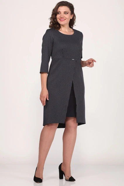 Платье полуприлегающего силуэта, с круглым вырезом горловины, отрезным лифом и юбкой А-силуэта. Перед с талиевыми вытачками, с верхней юбкой на запах и прямой нижней из отделочной ткани. По центру лифа пришита лейба. Спинка со средним швом и талиевыми вытачками. В шве потайная тесьма-молния. Верхняя юбка спинки с фигурным низом, нижняя юбка из трикотажной подкладки. Рукава втачные, одношовные, длиной 3/4. Размеры 42-46: длина платья 104 см, длина рукава 46 см. Размеры 48 - 52: длина платья 107 см, длина рукава 47 см