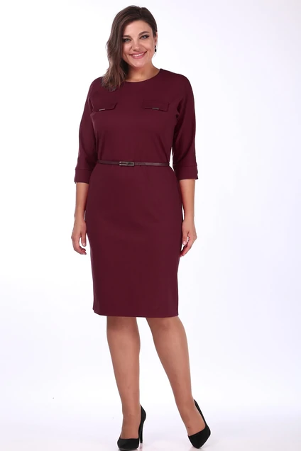 Платье женское из трикотажного полотна, слегка заужено книзу, с круглым вырезом горловины, цельнокроенными рукавами с манжетами понизу. Деталь переда с нагрудными клапанами. Спинка со средним швом, застежкой на тесьму "молнию" и шлицей. Комплектуется съемным поясом. Размеры 46-50: длина платья 100 см, длина рукава 42 см
