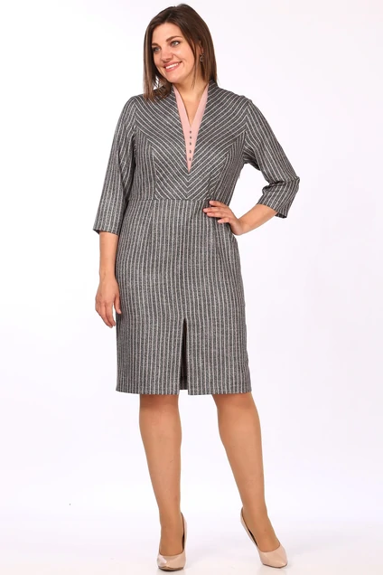 Платье полуприлегающего силуэта, с V - образным вырезом горловины. Перед отрезной по линии талии. Лиф с рельефами и отделочной деталью по горловине. Юбка с талиевыми вытачками и разрезом в среднем шве. В левом боком шве потайная застежка - "молния". Спинка с талиевыми вытачками и среднем швом. Рукава втачные, одношовные, длиной 3/4. Размеры 48-52: длина платья 100 см, длина рукава 46 см. Состав: ПЭ 63%, вискоза 35%, ПУ 2%. Подкладка: 100% ПЭ.