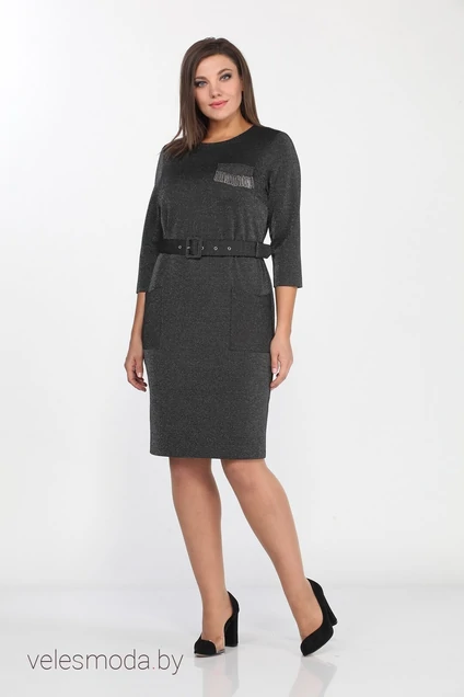 Платье женское, нарядное, из плотного трикотажного полотна, длиной ниже линии колен, с круглым вырезом горловины. Платье прямого силуэта. Перед с нагрудными вытачками, накладными карманами фигурной формы, выходящие из боковых швов и клапаном с левой стороны. Низ клапана с отделочной тесьмой. Спинка со средним швом и разрезами. Рукава втачные, одношовные, длиной 3/4. Платье комплектуется съемным поясом с пряжкой в цвет изделия. Размеры 48-52: длина платья 98 см, длина рукава 47 см. Размеры 54-58: длина платья 101 см, длина рукава 48 см