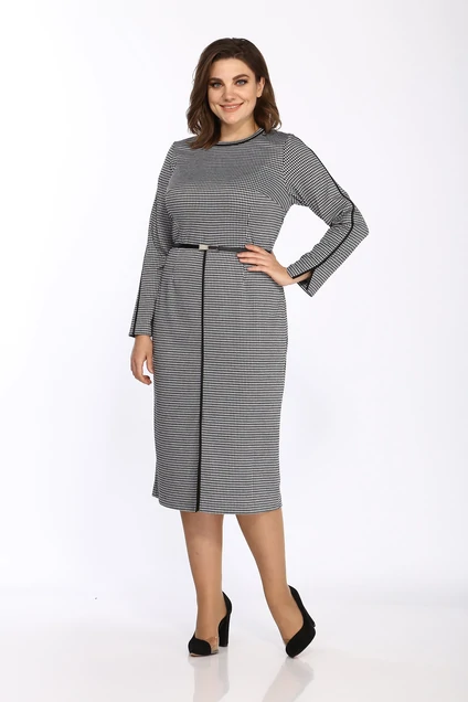 Платье женское, полуприлегающего силуэта, из трикотажного полотна. С круглым вырезом горловины, обработанным отрезной деталью с кантом. Деталь переда с нагрудными и талиевыми вытачками. Переднее полотнище юбки со средним швом с кантом и разрезом. Спинка цельная с талиевыми вытачками. Рукава втачные, двухшовные, с кантом и разрезами. Платье комплектуется съемным поясом. Размеры 48-52: длина платья 112 см, длина рукава 60 см.