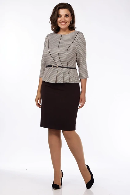 Платье женское прилегающего силуэта, из текстильного материала. С круглым вырезом горловины. Отрезное по талии. Лиф переда из 4-ех частей, с фигурными членениями в швах, которых обработан кант. Лиф спинки со средним швом, вытачками от горловины и талиевыми вытачками. С баской, по переду со складками. Юбка платья прямая, заужена книзу. С талиевыми вытачками. Задняя часть юбки платья со средним швом, заканчивающимися разрезом. Комплектуется съемным поясом с пряжкой. Размеры 46-50: длина платья 94 см, длина рукава 44 см. Размеры 52-56: длина платья 96 см, длина рукава 45 см.