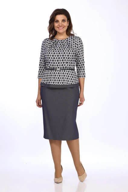 Платье женское, полуприлегающего силуэта. Из текстильного материала. Отрезное по линии талии. С круглым вырезом горловины, по переду заложены складки. Лиф спинки с талиевыми вытачками и средним швом, в котором обработана потайная застежка на тесьму - "молнию". Верхняя часть платья с баской с отделочной деталью понизу. Юбка платья с талиевыми вытачками, со средним швом, заканчивающимся шлицей, слегка заужена книзу. Рукава втачные, одношовные, длиной 3/4. Платье комплектуется съемным поясом. Размеры 46-50: длина платья 112 см, длина рукава 44 см. Размеры 52-56: длина платья 114 см, длина рукава 45 см.
