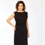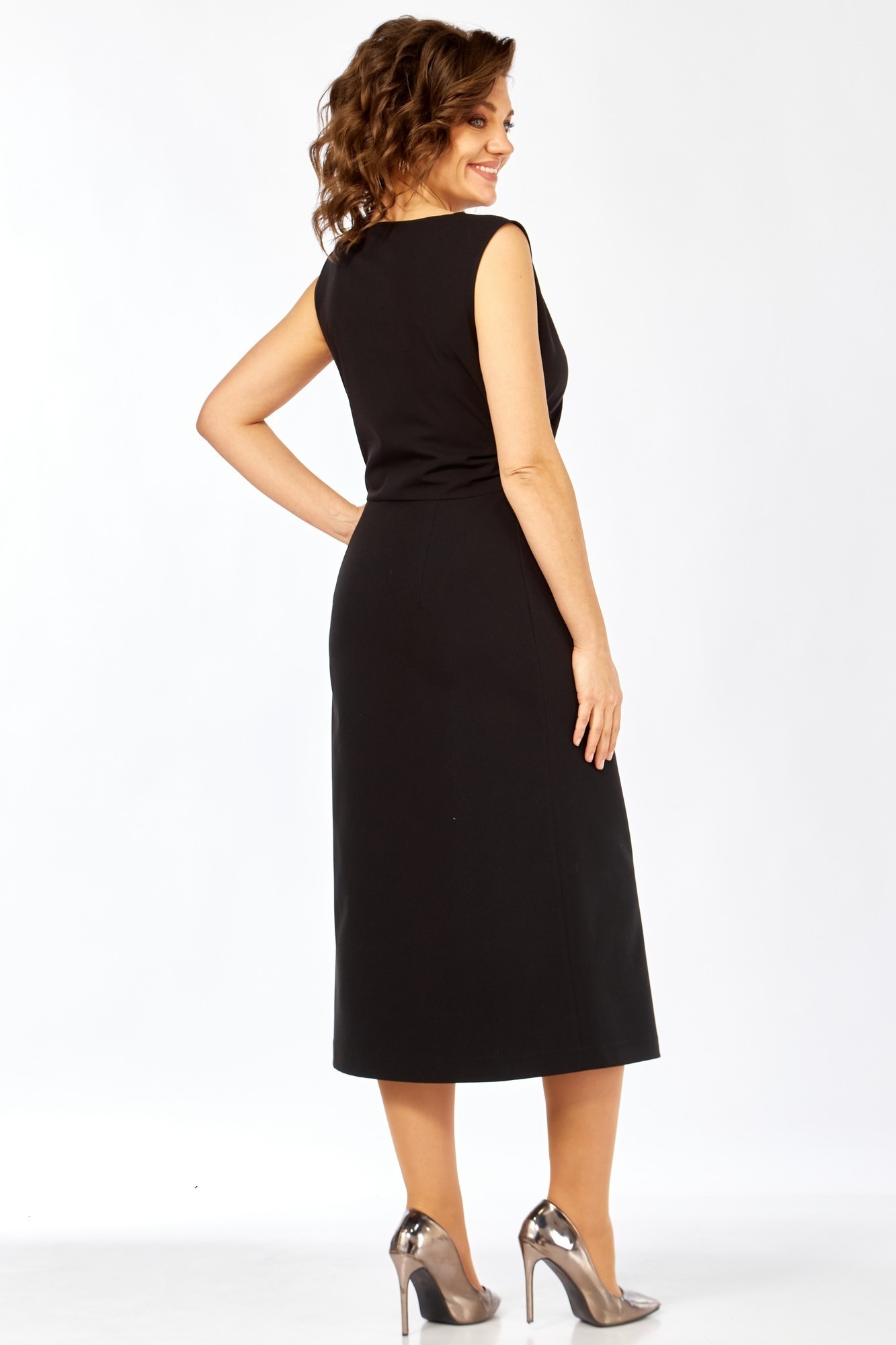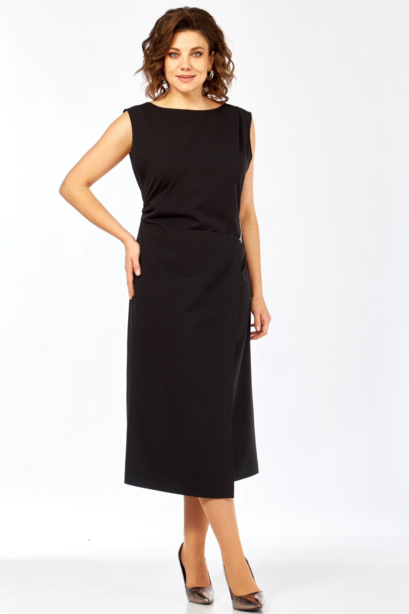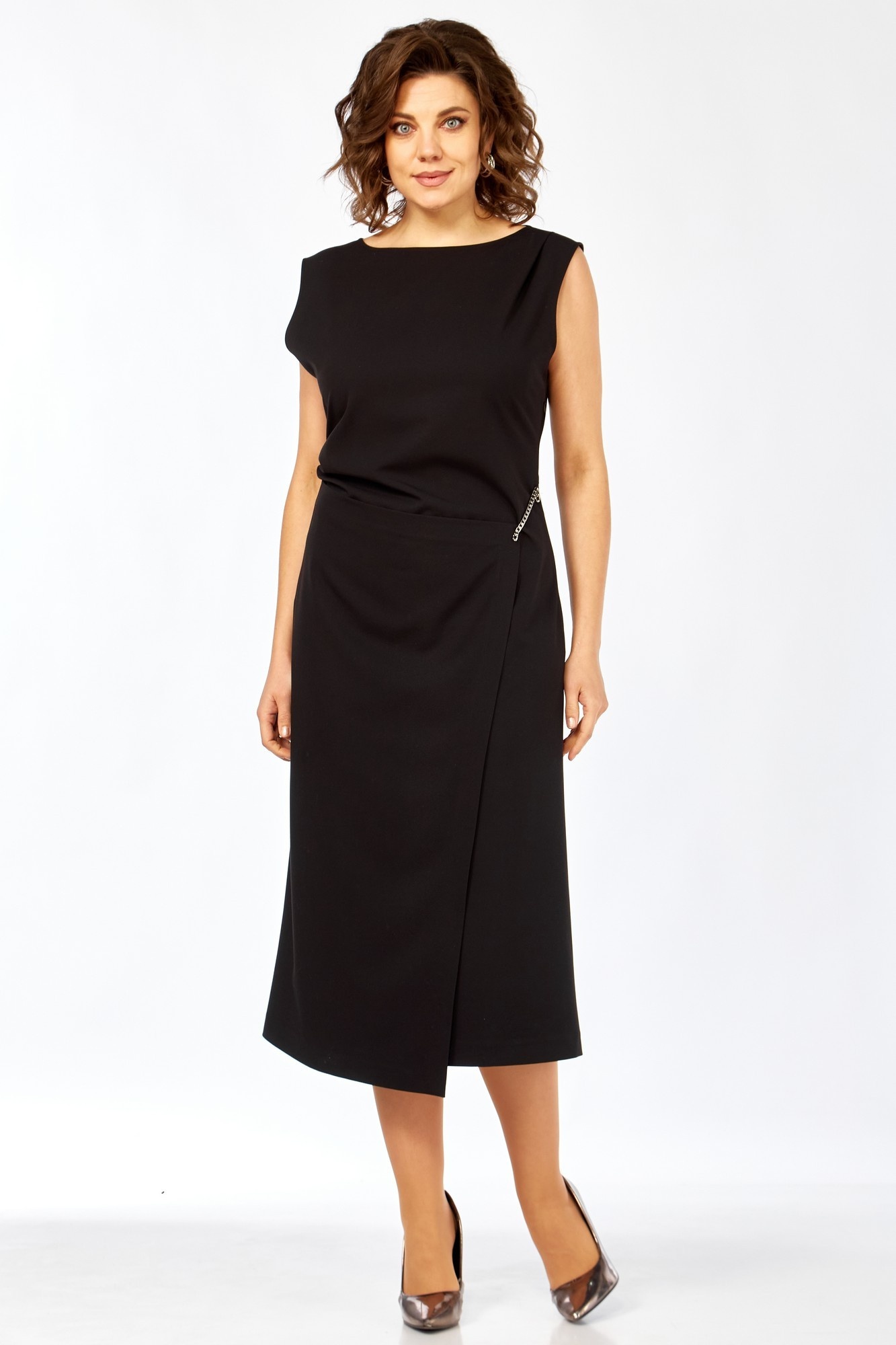 Платье полуприлегающего силуэта. Вырез горловины лодочкой. В нижней части платья по переду выполнена имитация запаха, зафиксированного на декоративную цепочку. В левом боковом шве расположена потайная молния, по правому боковому шву выполнены декоративные защипы. Спинка отрезная по линии талии с талиевыми вытачками. Длина изделия по спинке 119 см. Тип ткани плательная. Черное платье подойдет как для офиса, так и для торжественных мероприятий.