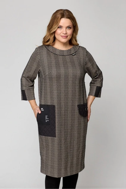 Платье женское, полуприлегающего силуэта, с втачными рукавами, длиной до линии колена, с втачной бейкой по горловине. Деталь переда платья с нагрудными вытачками, с карманами в боковых швах, с левой стороны расположен клапан с «патой» и полукольцом, справа – отделочный элемент с декоративной аппликацией. Рукава втачные одношовные, с притачными манжетами. Манжеты с отделочным элементом. Вырез горловины платья округлой формы, с втачной бейкой, в шов соединения вставлен отделочный кант. Длина спинки – 102см. Длина рукава - 44см, ширина рукава – 20см.