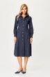 Платье женское из джинса, прилегающего силуэта, расширенное к низу,длиной ниже линии коленей, с втачными рукавами, с втачным воротником, отрезное на уровне линии талии, с центральной застежкой на 9 кнопок и 1 кнопку на стойке воротника. Лиф деталей переда платья с нагрудными вытачками, исходящими от талии, с накладными карманами и клапанами. Лиф детали спинки с 2-мя вытачками. Юбка платья конической формы, в боковых швах обработаны наклонные карманы, заднее полотнище с кокетками, передние полотнища с вытачками. Рукава втачные одношовные, с притачными манжетами, с застежкой на 1 кнопку. Разрезы обработаны окантовкой, по швам притачивания заложены по две складки. Воротник сорочечный с отрезной стойкой
