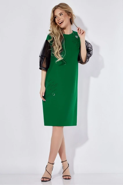 Платье женское, нарядное, , с втачными рукавами, На детали переда и спинки платья на уровне линии талии застрочены по 2 вытачки-складки. Рукава втачные одношовные, из сетки. Попереду платья вверху и внизу расположена дизайнерская вышивка.