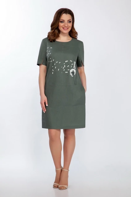 Платье полуприлегающего силуэта выполнено из натурального льна с вискозой и авторской печатью. Платье с функциональными карманами. Платье расширено к низу, длина до середины колена. Впереди центральный шов, подрезы и внутренние карманы, по спинке - центральный шов с застежкой молния и подрезы ниже талии. Рукав короткий, с разрезом. Линии притачивания подчеркнуты отделочными строчками.