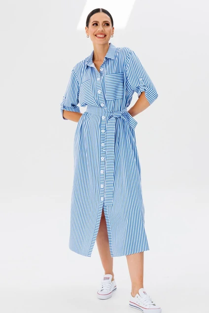 Спинка платья имеет горизонтальную кокетку высотой 14,5 см. По центру переда настрочные планки на функциональную застежку петли-пуговицы. Горловина обработана воротником рубашечного типа на стойке. Рукав втачной, одношовный, с цельнокроеной манжетой и патой, которая трансформирует длину рукава и форму рукава, делая его короче/длиннее с помощью петли-пуговицы. Длина рукава-37 см (в зависимости от размерного ряда). Длина изделия по спинке 127 см.