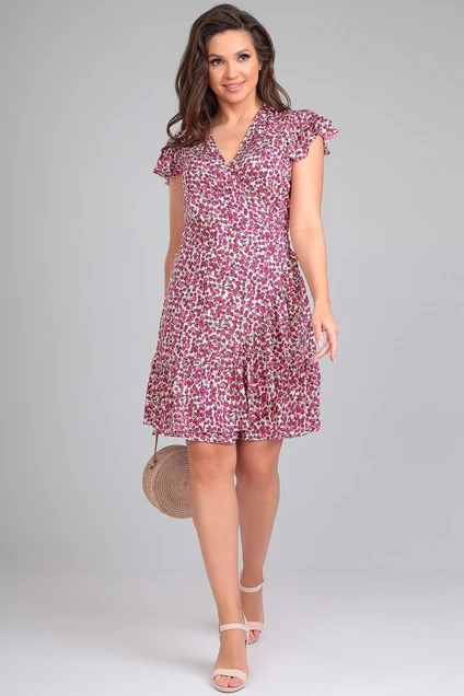 Платье легкое, на запахе, длиной до колена, без подкладки. По переду и спинке отрезной подрез переходящий в мягкий пояс фиксирующий запах платья. По низу переда и спинки волан со сборкой. Правая нижняя сторона переда с закруглением и волан оформляет закругление низа до пояса. Пройма платья оформлена рукавом "крылышко" в виде двух красиво струящихся воланов разной ширины.