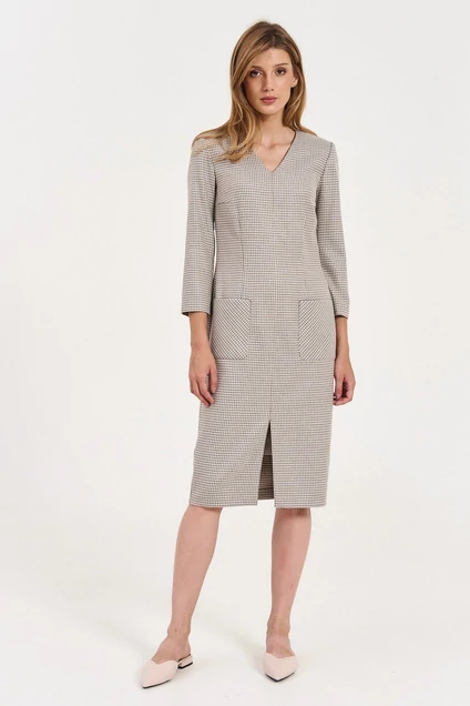Платье женское полуприлегающего силуэта, втачного покроя на шелковистой, эластичной подкладке. Перед со средним швом, талиевыми вытачками и нагрудными вытачками из бокового шва. По переду накладные карманы с закругленными углами. В среднем шве переда разрез. Спинка с талиевыми вытачками. Вырез горловины V-образный. Рукав одношевный длиной 3/4.