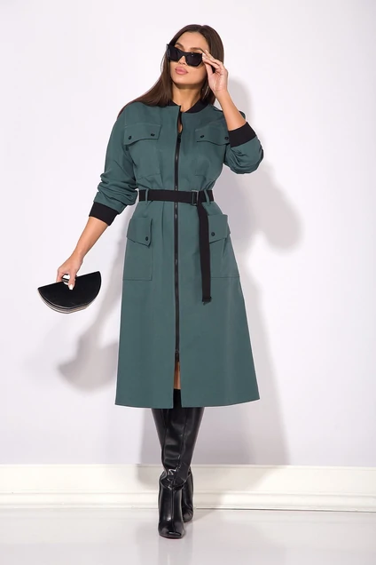 Эффектное платье из хлопкового джинса полуприталенного силуэта. Модель отрезная по линии талии с легким расклешением к низу. Застежка центральная – металлическая тесьма-молния с двойным бегунком! По лифу расположены накладные карманы с клапаном. Рукав на рубашечной пройме длинный. По низу рукава предусмотрены мягкие манжеты. Горловина округлой формы с мягким довязом. По полочке также расположены накладные карманы с фигурным клапаном и застежкой на пуговицах. Спинка без особенностей. В комплекте съемный пояс в стиле спорт-шик с металлической пряжкой.