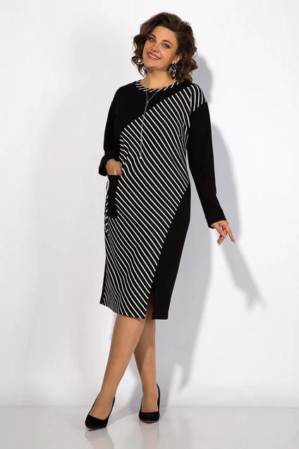 Отличный вариант для повседневных образов, который можно смело носить на работу, в офис и не только! Платье выполнено из качественного однотонного трикотажа в компаньоне с трикотажной полоской. Модель со спущенной линией плеча и длинным рукавом. Вырез горловины округлый на мягкой планке. По полочке расположен ассиметричный подрез, переходящий в небольшой разрез на свободу движения. Платье заужено к низу. Изюминкой данной модели служит накладной карман с декоративной пряжкой в тон изделия. Материал трикотажа плотный, хорошо держит форму; благодаря линиям членения модель зрительно стройнит, скрывает недостатки, подчеркивая ваши достоинства! Длина по спинке – 110 см, рукав – 62 см.