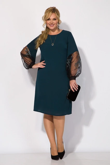 Элегантное, нарядное платье, трапециевидного силуэта в глубоком зеленом оттенке морской волны. Платье трапециевидного силуэта от линии груди. Вырез горловины округлый. Эффектный пышный рукав украшает вставка из сетки с кружевом. Рукав по низу присборен на декоративную резинку. Изюминкой данной модели служит эффектный вырез по спинке, переходящий в бант-завязку! Платье на стрейчевой трикотажной подкладке. Платье идеально подходит на любой тип фигуры, а дизайнерская вышивка является главным акцентом в данной модели. Длина-102 см., рукав – 63 см.