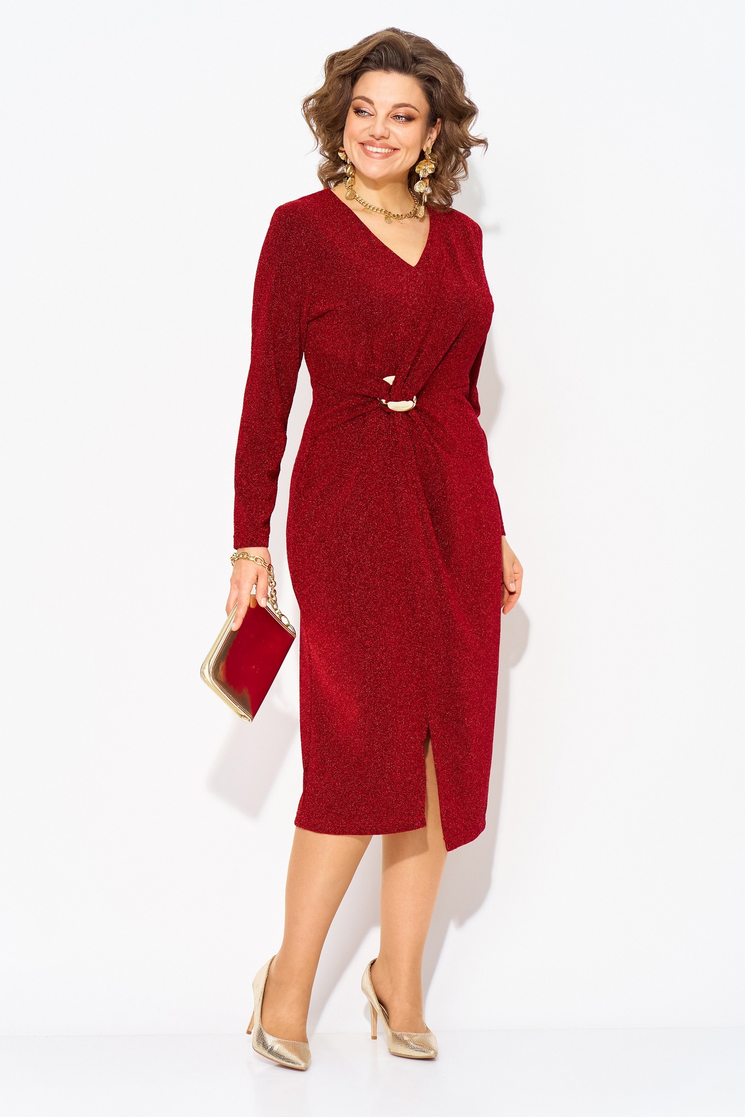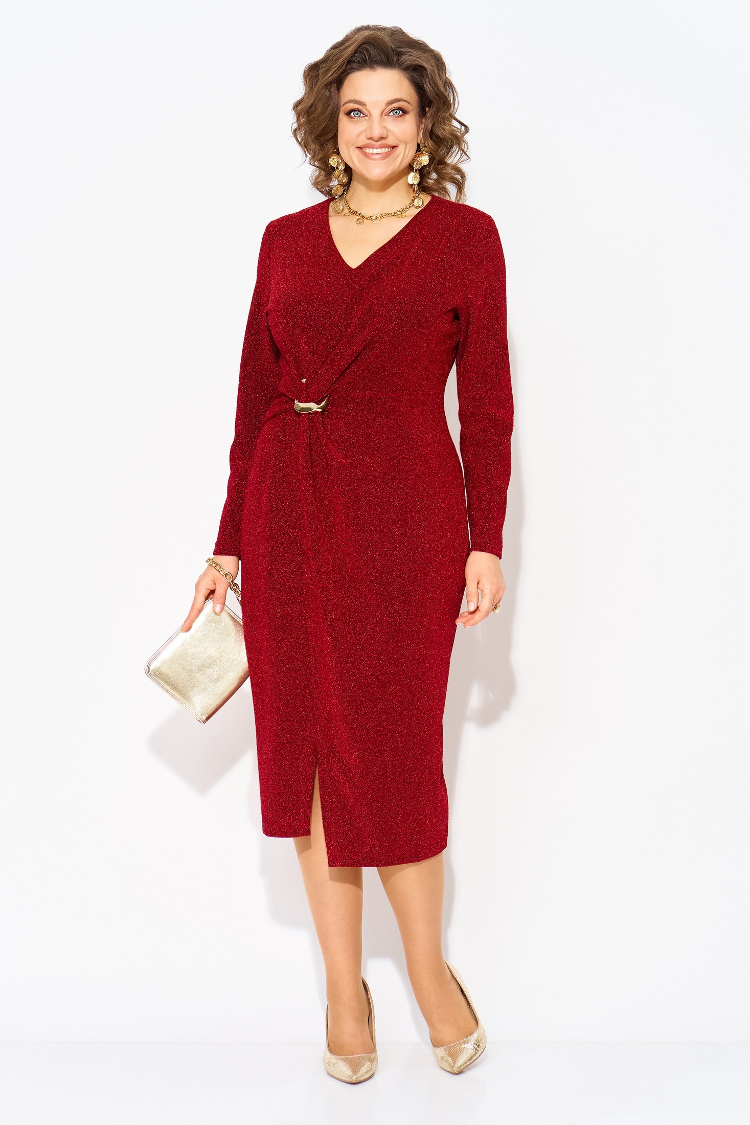 Эффектное вечернее платье с драпировкой подчёркивает фигуру, выгодно обтягивая силуэт и создавая элегантный образ. V-образный вырез добавляет нотку соблазна, а разрез придаёт образу лёгкости и уверенности. Это женское платье — идеальный выбор на вечер, если вы хотите выглядеть ярко, стильно и женственно. Идеально садится по фигуре, подчёркивает талию и визуально вытягивает силуэт. Скрывает все недостатки, подчеркивая лишь достоинства. Гладкий и мягкий с изнанки трикотаж, сверху с эффектом мерцания. Длина – 112 см, рука – 62 см