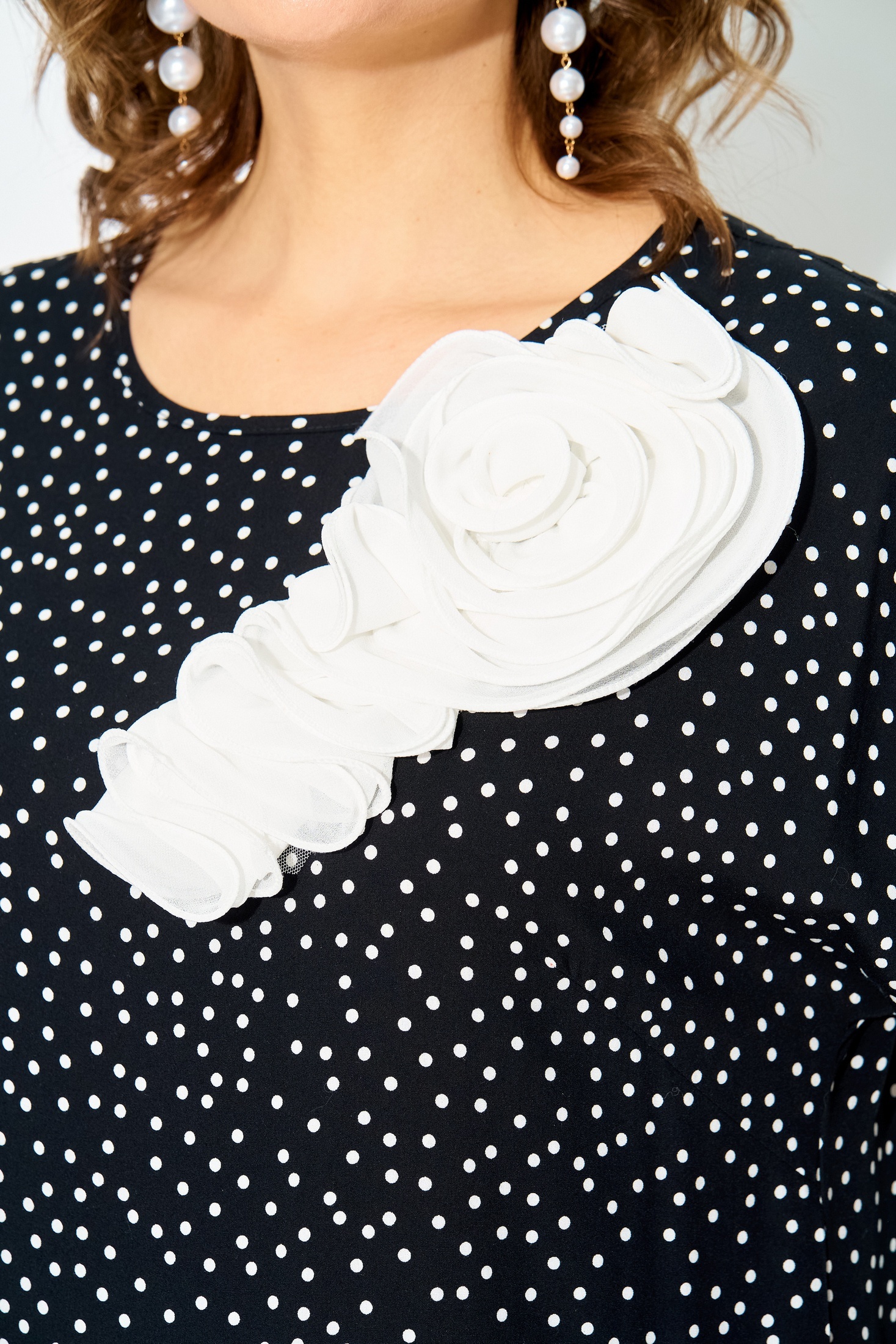 Платье 1528 Liliana-style — вечерний наряд в коллекции бренда Liliana. Легкий состав из 70% хлопка, 20% вискозы и 10% полиэстера делает платье комфортным для летних вечеров. Силуэт трапеция с коротким рукавом и округлым вырезом горловины обеспечивает романтичный и свободный образ. Наряд украшен съёмным декоративным цветком из креп-шифона и карманами в боковых швах. Идеально для свадеб и торжественных мероприятий. Черно-белый цвет с принтом в горошек добавляет изысканности, а длина по спинке 125 см и длина рукава 20 см подчеркивают комфорт и стиль.