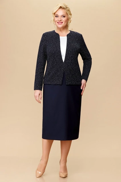 Повседневное платье на рост 164см. полуприлегающего силуэта средней длины за колено. Рукав втачной длинный. Платье имитация тройки -- блузка, жакет, юбка. В платье сочетаются три вида ткани: трикотаж и текстиль плательный и блузочный. Вырез горловины фигурный. Перед платья с нагрудными вытачками из проймы, спинка со средним швом и плечевыми вытачками. В среднем шве обработаны застежка молния и шлица. Длина спинки -- 114,5см. ПОГ:60р-61,5см, 62р-63,5см, 64р-65,5см. ПОБ:60р-65,5см, 62р-67,5см, 64р-69,5см. Ткань текстильная -- 96% полиэстер 4% спандекс