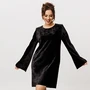 Платье полуприлегающего силуэта, по переду отрезное по линии талии. Верхняя часть переда с нагрудными рельефами и с V-образным вырезом горловины обработанной обтачкой. Нижняя часть переда с высоким разрезом и вставкой из шифона на трикотажной подкладке. Спинка со средним швом, в который вставлена потайная молния, и таллиевыми выточками. Рукав втачной 3/4 одно шовный.