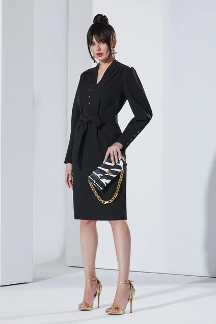 Платье с фигурным вырезом горловины по переду и стойкой по спинке. По талии съёмный пояс из основной ткани. Изделие со складками от кокетки по переду и спинке. Перед с декоративными пуговицами в верхней части и средним швом. Спинка с разрезом в среднем шве. Рукава втачные, со сборкой по окату и складкой с пуговицами в нижней части.