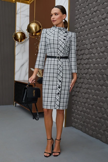 Платье с воротником - стойкой и съёмным ремнём по талии. Перед с декоративной деталью с пуговицами от среднего шва. Спинка с талиевыми вытачками, потайной молнией и шлицей в среднем шве. Рукава втачные.