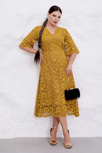 Изысканное платье с фигурным вырезом и фестонами выполнено из итальянского ажура с бархатным напылением и тонкой подложки отлично впишется в ваш гардероб. Трендовое платье полуприлегающего силуэта отрезное по линии талии с юбкой расширенной к низу. Лиф со средним швом украшен дизайнерскими пуговками с кристаллами и вертикальными вытачками. Вырез горловины V-образный оформлен фигурной линией из фестонов, как по низу рукава и юбки. Спинка со средним швом и талиевыми вытачками, застежка на потайную молнию в среднем шве спинки. Рукав втачной по форме колокол расширен к низу, низ оформлен фигурной линией фестонов.