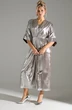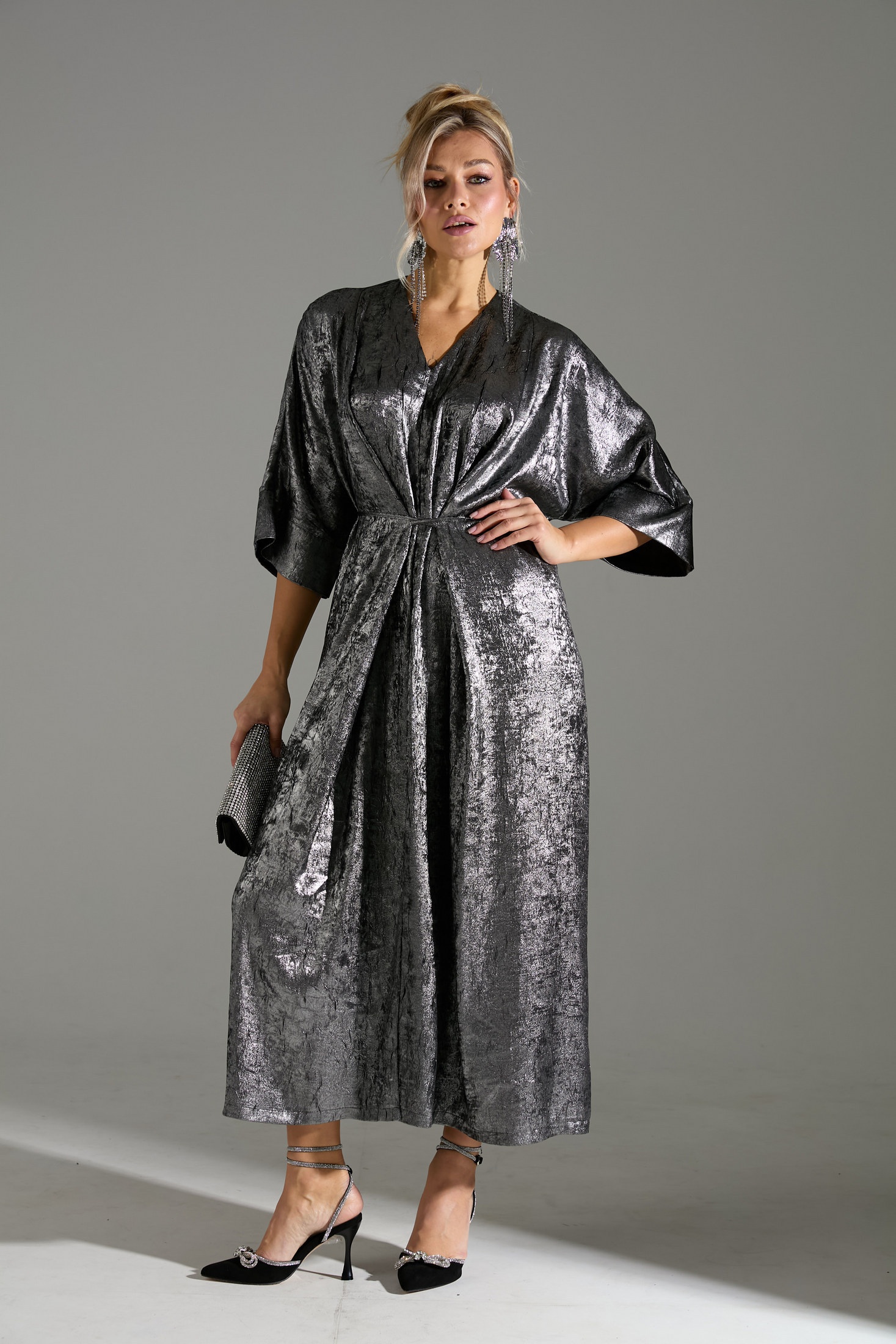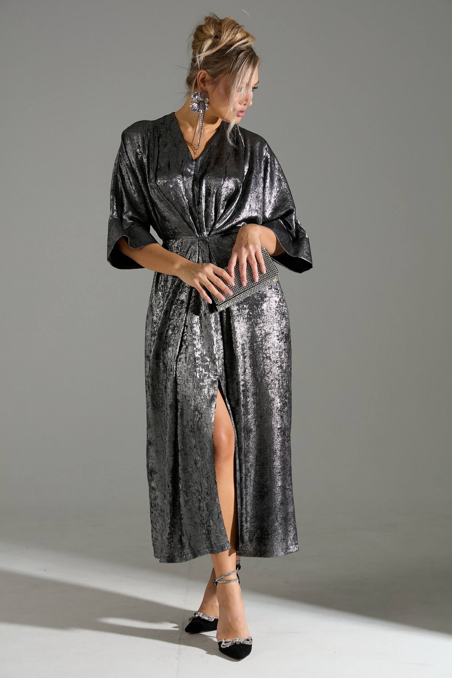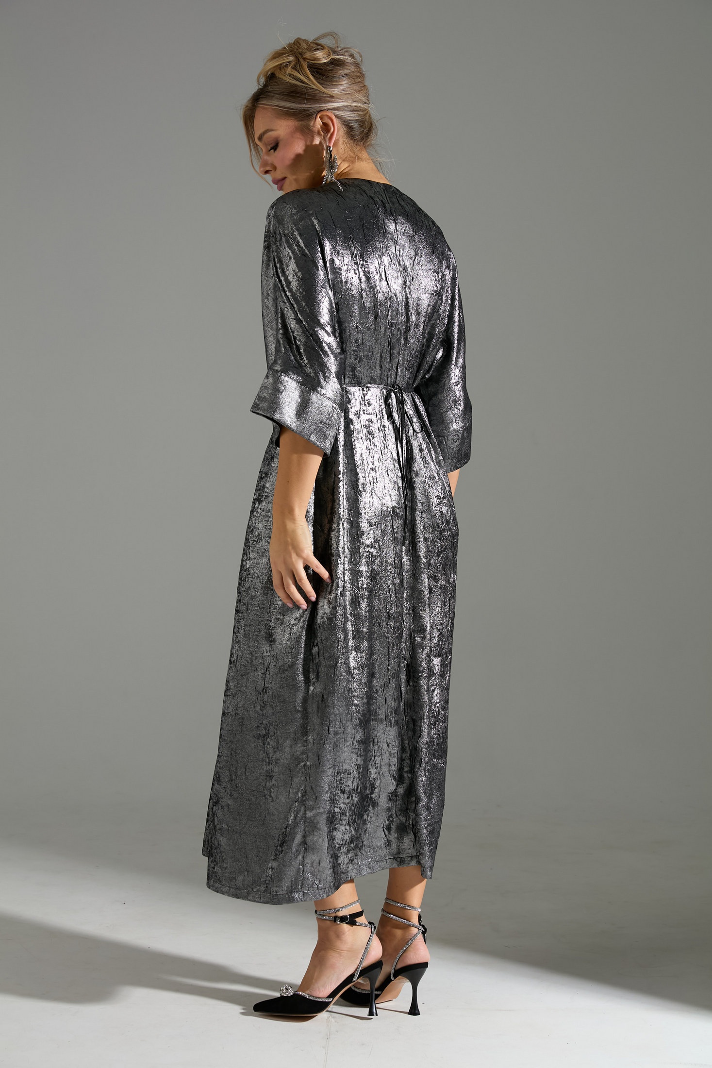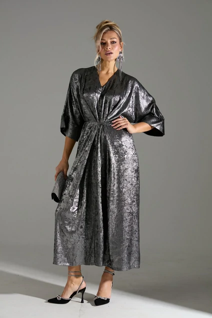 Это изысканное серебристое платье с мерцающим эффектом идеально подойдет для вечера. Платье выполнено в свободном стиле с цельнокроеными рукавами ¾, что добавляет ему элегантности и непринужденности. Дизайн платья дополнен двумя тканевыми тесьмами на передней части, которые завязываются на талии, позволяя акцентировать силуэт по желанию. Эта модель станет превосходным выбором для создания запоминающегося образа на любое торжество.