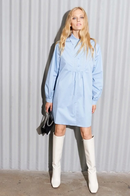 Платье рубашечного кроя. Рукав втачной по низу рукава притачная манжеты с вышивкой и застежкой на петлю и пуговицу. Воротник рубашечного кроя на стойке. По переду отрезная кокетка с вышивкой и застежкой на петли и пуговицы. В боковых швах прорезные карманы. По спинке кокетка. Низ платья фигурный.