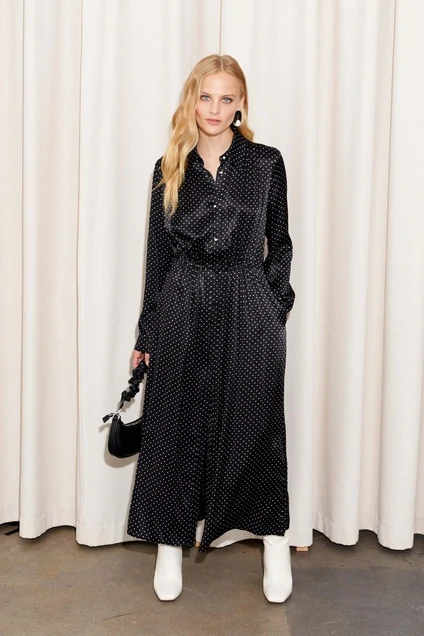 Платье женское из вискозной ткани, полуприлегающего силуэта, с втачными рукавами, рубашечным воротником. Платье распашное с застежкой на петли и пуговицы по планке. По линии талии отрезное со сборками, фиксируется эластичной тесьмой. По переду защипы от плечевых швов. Рукава одношовные, с манжетами, застегивающимися на петлю и пуговицу. Карманы в боковых швах.