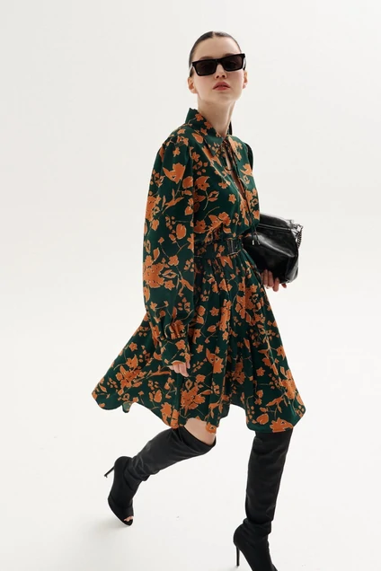 Платье полуприлегающего силуэта из плательной ткани. Рукав втачной, по верхней и нижней части рукава сборка, по низу рукава манжеты на застёжку петля/пуговица. По горловине воротник рубашечного типа на завязку и фигурный вырез в форме капли. Платье по линии талии отрезное на резинке. По юбке платья притачной волан на сборку. В комплектацию входит съёмный пояс, который выполнен из основной ткани на резинке с металлической пряжкой.