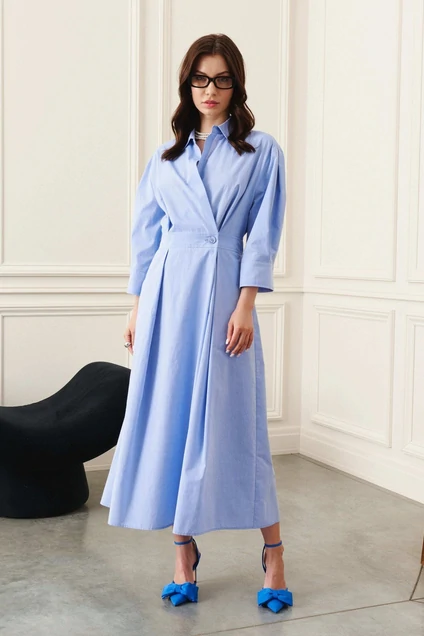 Платье свободного кроя отрезное по линии талии. Рукав спущенный со складками в верхней части, манжетой по низу. Воротник рубашечного кроя, застёжка на запах, двубортная на петлю и пуговицу. В боковых швах карманы. По спинке отрезная кокетка, по линии талии широкая резинка.