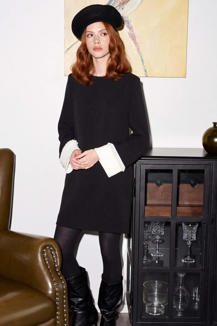 Платье свободного кроя, А- силуэта, на подкладке. Рукав втачной, по низу рукава из отделочной ткани в белом цвете по шву притачивания манжеты - тесьма с бисером. Округлый вырез горловины, нагрудные вытачки из проймы в боковых швах, прорезные карманы, по спинке средний шов переходящий в застёжку на потайную молнию.
