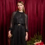 Платье полуприлегающего силуэта, выполнено из костюмной ткани. Рукав втачной длинный, выполнен из хлопка. По верхней и нижней части рукава сборка, по низу рукава манжета на застежку на петли и пуговицы. По горловине воротник рубашечного кроя. По левой стороне складка имитирующая запах. Выше линии груди пришиты металлические пуговицы. По спинке средний шов переходящий в застежку на потайную молнию.
