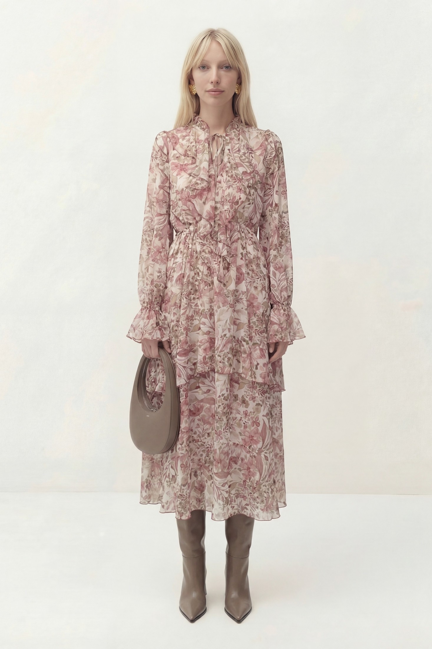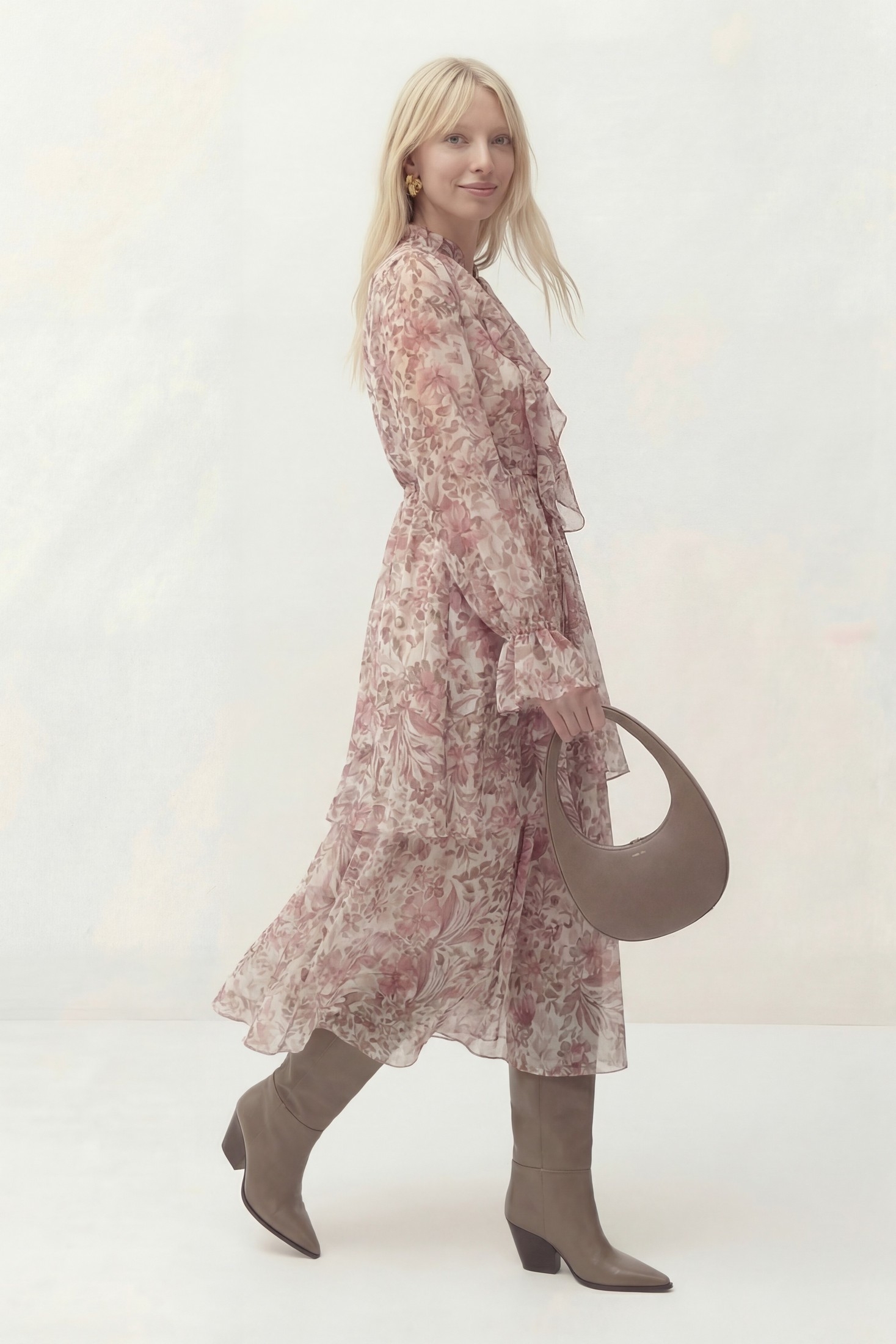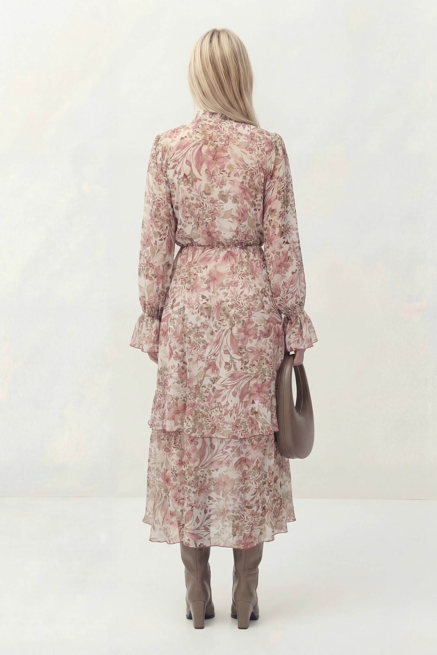 Платье 1817 Lokka из коллекции бренда Lokka представляет собой элегантное двухслойное изделие свободного силуэта. Верхний слой выполнен из шифона, обеспечивая легкость и воздушность. Длинные втачные рукава с резинкой по низу добавляют комфорта, а втаченная рюша впереди подчеркивает женственность. Воротник-стойка и завязки по горловине добавляют стильной многослойности. Воланы с отлетными концами и фигурный подрез по низу создают динамичный образ. Платье украшено цветочным принтом, идеально подходящим для весеннего или осеннего сезона. Приятная цветовая палитра и свободный крой делают его подходящим выбором как для повседневного, так и для праздничного выхода.