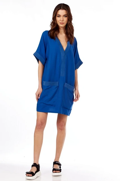 Рукав цельнокроенный, до локтя, собран на трикотажный довяз. Низ рукава оформлен цельнокроенной манжетой с отворотом. Вырез горловины V-образный, оформлен притачными планками с декоративной резинкой. По переду выполнены накладные карманы.