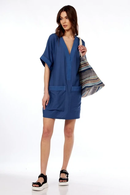 Рукав цельнокроенный, до локтя, собран на трикотажный довяз. Низ рукава оформлен цельнокроенной манжетой с отворотом. Вырез горловины V-образный, оформлен притачными планками с декоративной резинкой. По переду выполнены накладные карманы.