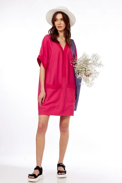 Рукав цельнокроенный, до локтя, собран на трикотажный довяз. Низ рукава оформлен цельнокроенной манжетой с отворотом. Вырез горловины V-образный, оформлен притачными планками с декоративной резинкой. По переду выполнены накладные карманы.