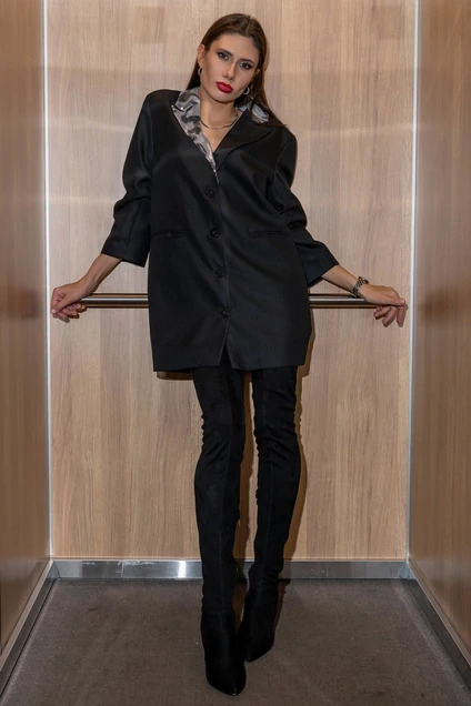 Платье прямого силуэта пиджачного покроя с цениральной застёжкой на петли-пуговицы.Воротник и часть лацкана из пайеток.Рукава втачные с мягкими складками.длина-88 см длина рукава-51см