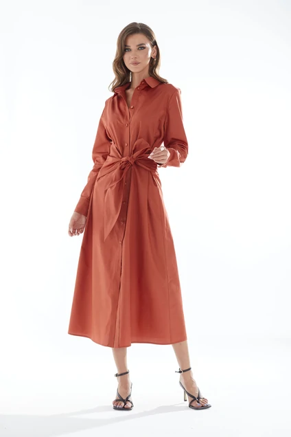 Стильное платье с завязками полуприлегающего силуэта, расклешенное книзу из хлопковой ткани. Воротник рубашечного типа с застежкой на пели и пуговицы. Рукав втачной длинный на манжете с застежкой на петлю и пуговицу. В боковые швы с обеих сторон вставлен декоративный широкий пояс.