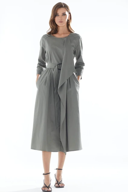Стильное платье из хлопковой ткани прямого силуэта. Горловина округлой формы, на спинке застежка на петлю и пуговицу. Рукав реглан двухшовный, по низу декоративная шлица с пуговицами. На полочке в рельеф вставлен декоративный волан. В боковых швах карманы. В комплект входит ремень с полукольцами. Длина платья: 119см