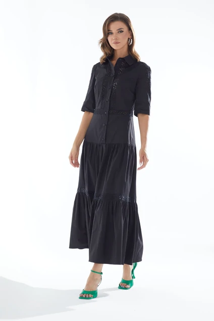 Платье полуприлегающего силуэта, расширенное книзу. Воротник рубашечного типа на притачной стойке. Перед с центральной застежкой на петли и пуговицы. По переду и спинке - талиевые вытачки. Платье по низу с двумя широкими воланами со сборкой. Рукав втачной короткий с притачной манжетой. Платье декорировано подрезами из ришелье по талии, рукаву, планке и волану. Рост 164-170 Длина изделия: 134 см