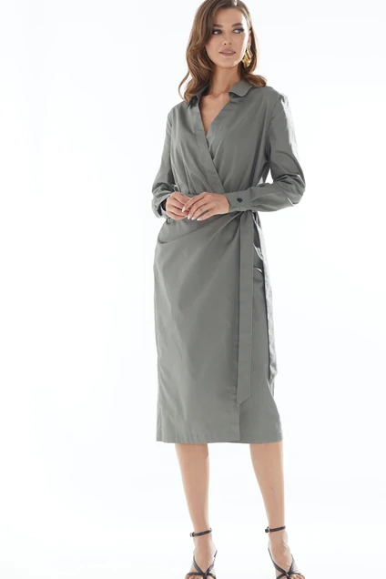 Стильное платье из хлопковой ткани полуприлегающего силуэта. Перед с V-образным вырезом, воротник отложной на стойке. Платье отрезное по линии талии на резинке, с декоративной отлетной деталью по переду. Рукав втачной. длинный ,по низу манжета на петлю и пуговицу. Длина платья: 114см (44-48р) 116см(50-54р)