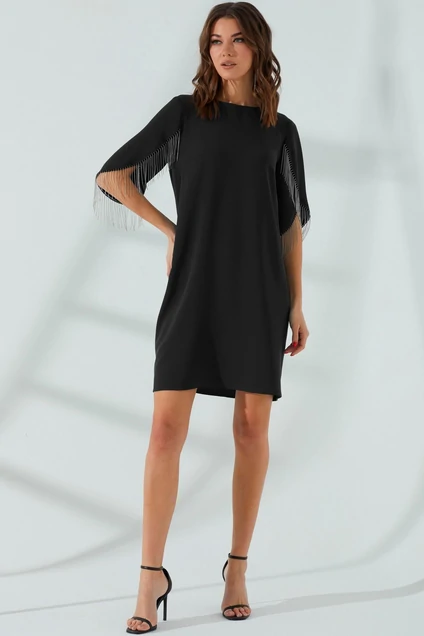 Нарядное платье прямого силуэта расширенное книзу из струящейся ткани. Горловина округлая, на спинке застежка на навесную петлю и пуговицу. Рукав втачной длиной ¾ с фигурным вырезом, декорирован отделочной тесьмой. По переду нагрудные вытачки. Длина платья: (92см -44-48р) ( 100см – 50-54р)( 110см – 56-60р)