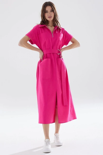 Стильное платье прямого силуэта из льняной ткани. Воротник рубашечного типа с застежкой на декоративную тесьму «молния». Рукав цельнокроеный с притачной манжетой. Перед платья со средним швом и разрезом. По переду располагаются кокетка и накладные карманы. Спинка с кокеткой и встречной складкой. В комплект входит съемный пояс. Обращаем ваше внимание, что фурнитура может незначительно отличаться от фото. Длина изделия: 125 см