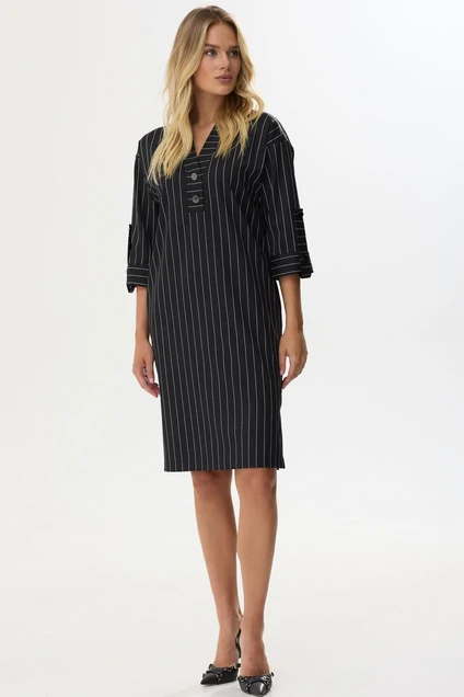 Женское платье свободного силуэта из костюмной ткани. Горловина c V-образным вырезом и фигурной планкой с декоративными пуговицами. Рукав со спущенной линией плеча, по низу манжета с декоративной патой и пуговицами. По спинке кокетка, в левом боковом шве по низу разрез. В боковых швах функциональные карманы. Обращаем ваше внимание, что фурнитура может незначительно отличаться от фото. Рост модели на фото 178см. Длина изделия: (44-48р - 102см)(50-54р - 106см)