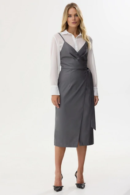 Стильный сарафан на запах полуприлегающего силуэта из экокожи на хлопковой основе. Сарафан отрезной по линии талии, лиф на регулируемых бретелях из основной ткани. По лифу вытачка переходящая в складку. По спинке талиевые вытачки. Длина изделия от талии: 77 см