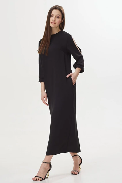 Нарядное платье полуприлегающего силуэта из струящейся ткани. Горловина округлая. Рукав втачной, одношовный с декоративным вырезом, по низу сборка и манжет. В среднем шве спинки потайная молния и по низу разрез. В комплект входит съемный ремень. Обращаем ваше внимание, что фурнитура может незначительно отличаться от фото. Длина изделия:123 см