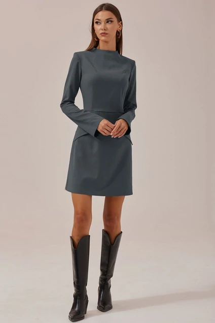 Платье прилегающего силуэта расширенное книзу из костюмной ткани. Горловина-стойка. Рукав втачной одношовный расширенный книзу, с молнией для регулирования ширины рукава. Платье отрезное по линии талии. На лифе переда нагрудные вытачки и рельефные швы, по спинке талиевые вытачки. На нижней части платья декоративные клапаны. На спинке застежка на потайную молнию. Платье на подкладке.Длина платья: (42-46р -90см)(50-55р - 94см)