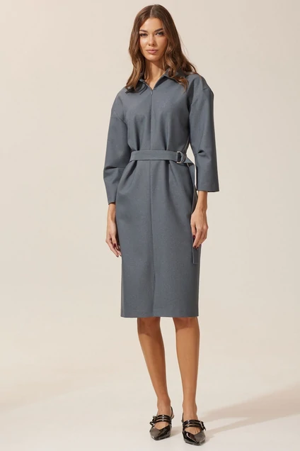 Платье из костюмной ткани, полуприлегающего силуэта длиной чуть ниже колена. Спущенная пройма, на рукаве на уровне локтя заложена декоративная складка. Воротник рубашечного типа с застежкой на потайную молнию. Платье с отрезным поясом. Спереди расположены боковые карманы. В комплекте к платью идет ремень из основного материала. Обращаем ваше внимание, что фурнитура может незначительно отличаться от фото. Длина изделия (в 44-48 р. – 106 см) (в 50-54 р. – 108см)